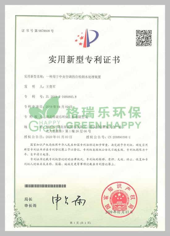 - 2025/06/30格瑞樂環(huán)保中央空調(diào)循環(huán)水殺菌除垢裝置榮獲國家專利?